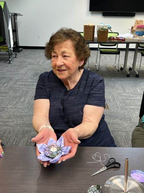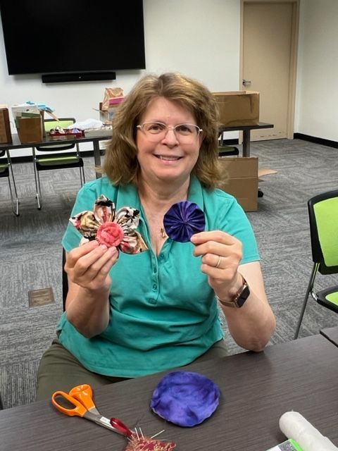 Yvonne has recently become the co-leader for the group. Yvonne enjoys sewing many different kinds of projects. She sews items that she needs--dog beds, BBQ covers, etc. She designs her own patterns for baby quilts that she shares as gifts. She recently created an 18x12” cushion in the shape of a big leaf for a 12” ceramic grasshopper that lives on her patio. Yvonne’s next project will be to re-upholster a cushion for a camel saddle. She will take apart the worn cushion to make a pattern.